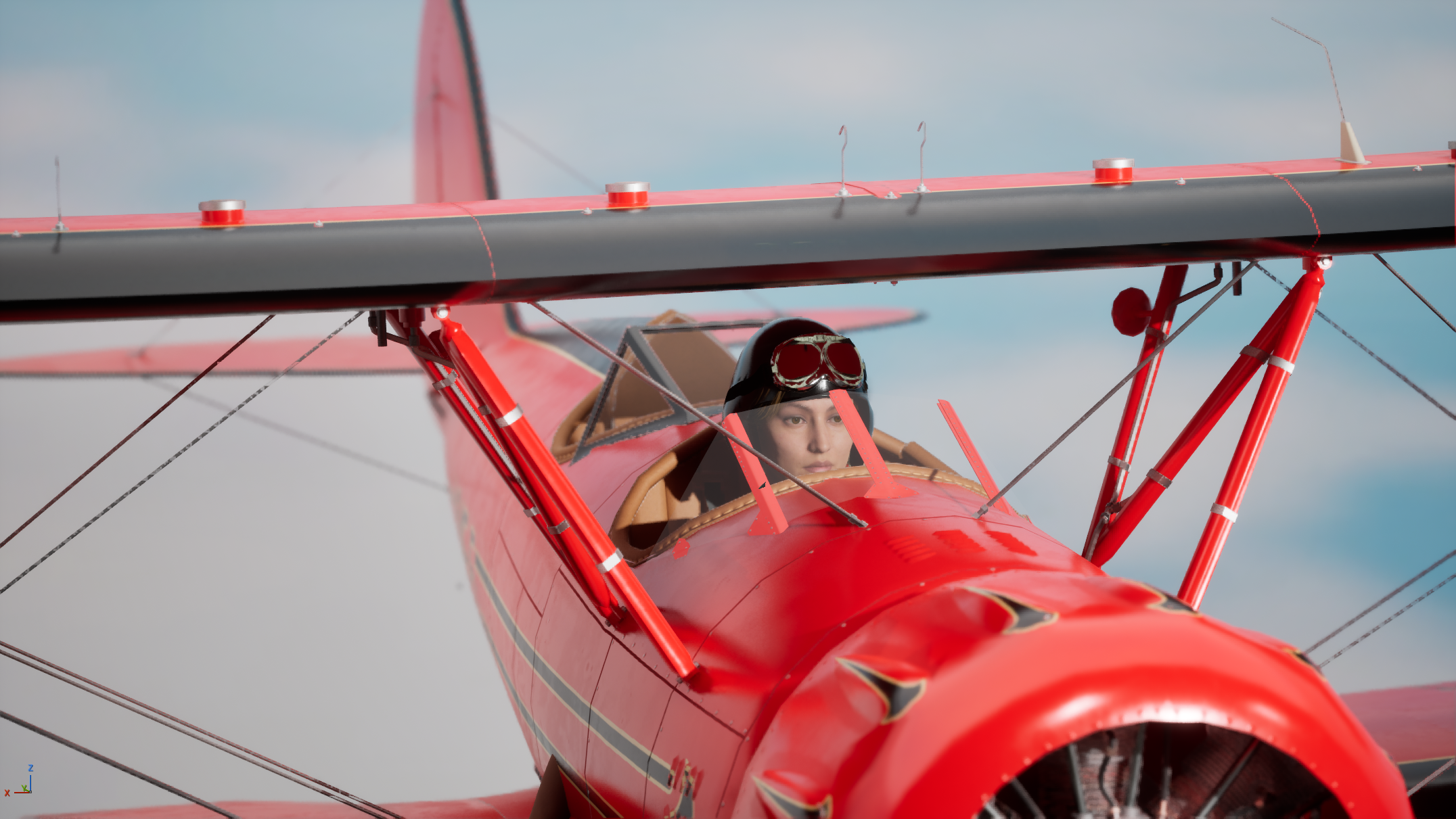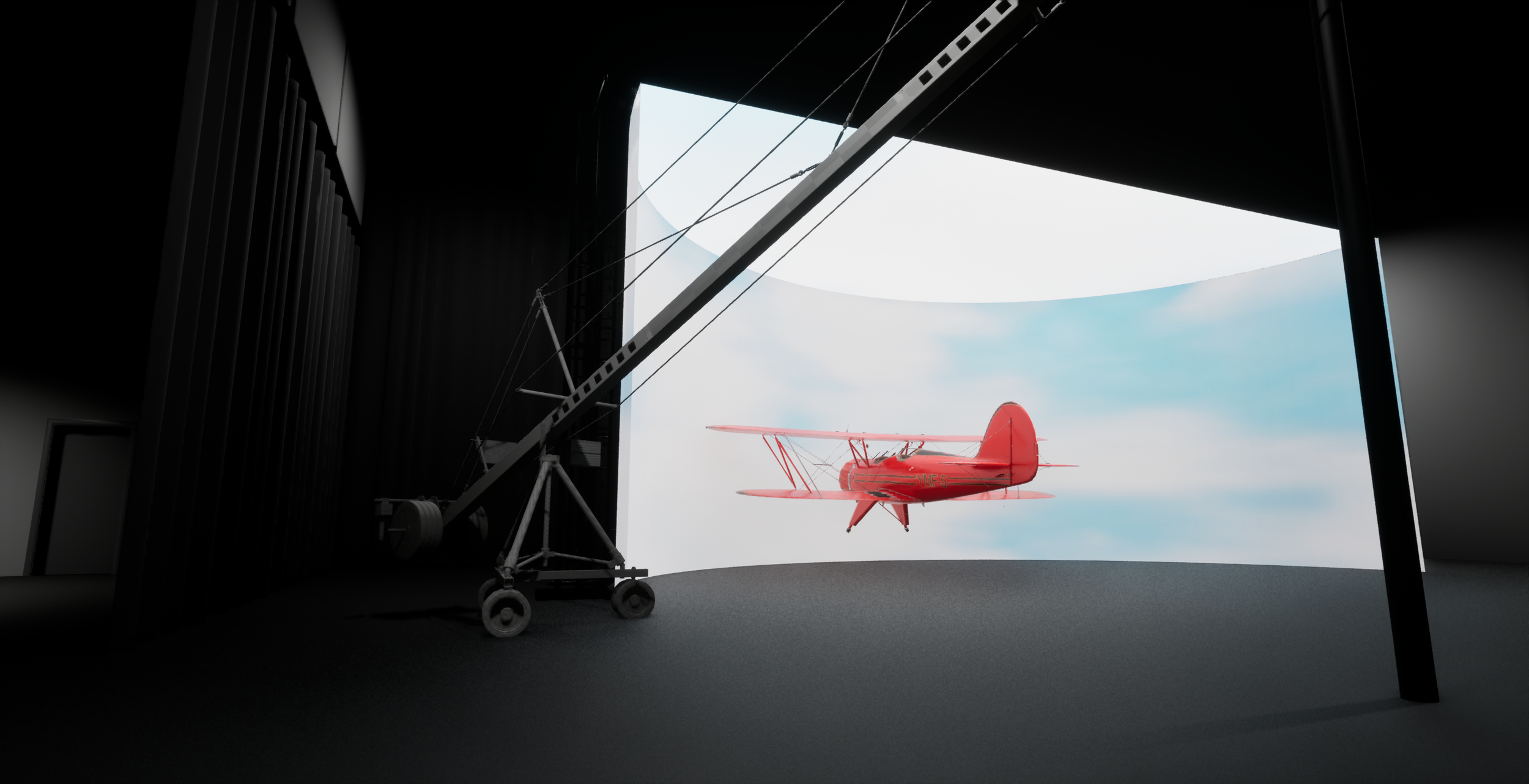 Final testing addressed cloud fidelity and continuity. Standard Unreal cloud solutions were replaced with a more art-directable sky system, enabling real-time cloud development on stage. Environmental continuity was refined by matching the grass runway and surrounding landscape to the real Fantasy of Flight location.